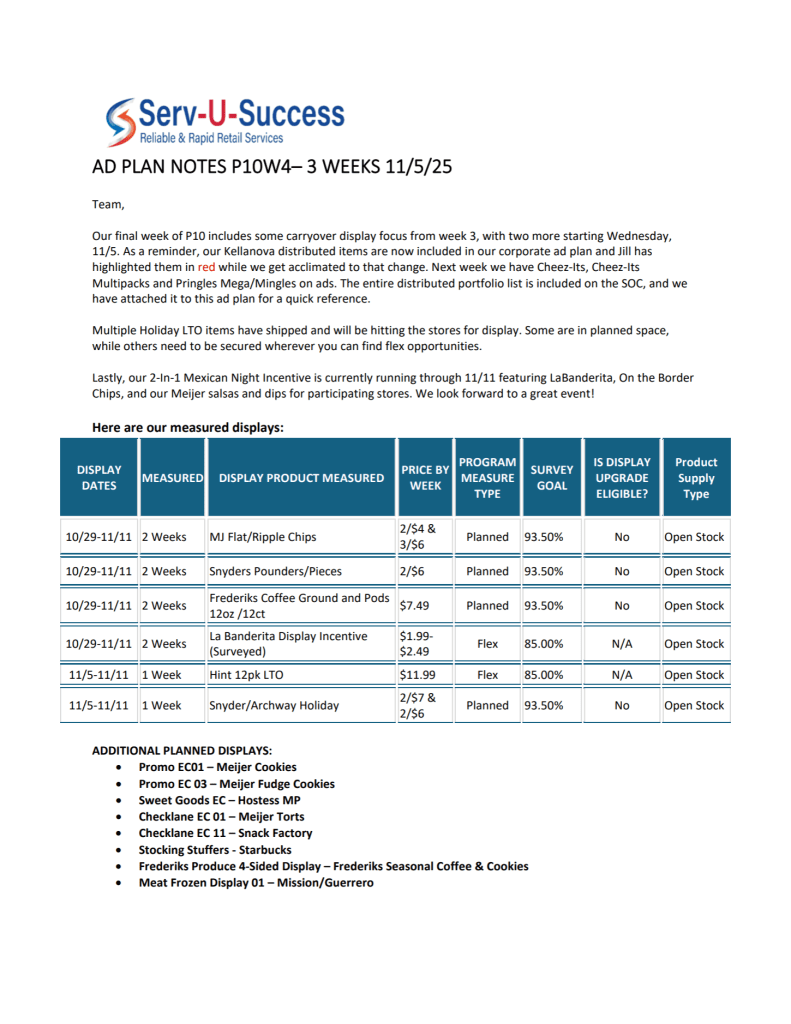 Remember also to face the displays in the center aisle. Complete what you can of live load and I will be in tomorrow to pick up where you leave off. I don’t see any ad changeovers on the display plan, so we could possibly get a lot done tomorrow, ahead of the visit.