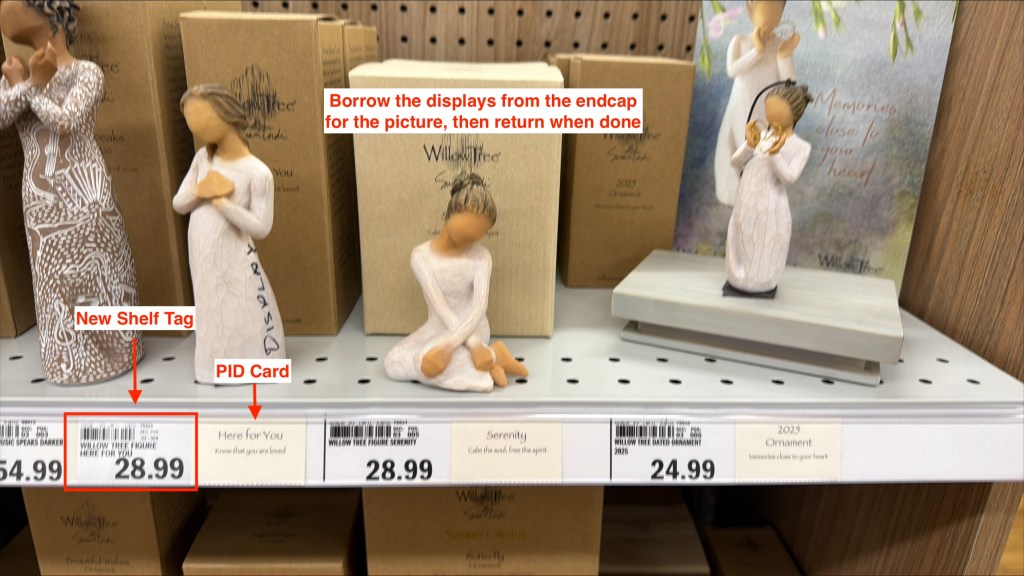Above you can see that Elizabeth requested that during the next Willow Tree service, we need to modify the shelf strips so that the PID card is on the right of the price tag. So while servicing Willow Tree, please make sure all PID cards that are on the left of the tag are corrected so they can be on the right instead. You can either slice up the shelf strips or acquire a Zebra and a Zebra printer and cover over the shelf strips so the card is on the right and the newly printed tag is on the left. I included an example of how I did that below.