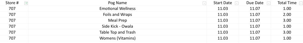 I worked alone overnight without the help of Hyer, since he was not available, so I wasn’t able to finish as much as I had hoped. I started by working on the Trim a Tree follow up, which involved locating and adding quite a few displays. I also did the Yogurt reset and after that I ran a live cart. What I discovered though was a lot of outs needed to be ran from backstock, so I had to stop running live load to fill from backstock. So there are a few carts left, but priorities were completed