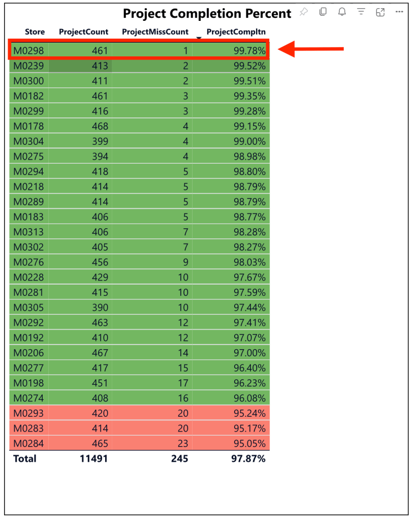 For the quarter, we are once again on track to be number one in project completion percentage, and this quarter, I delegated tasks throughout the team, and we only saw one miss from that. Everyone contributed to the project completion percentage success this time. Thank you team for your role in continuing our reign is top project completion store!