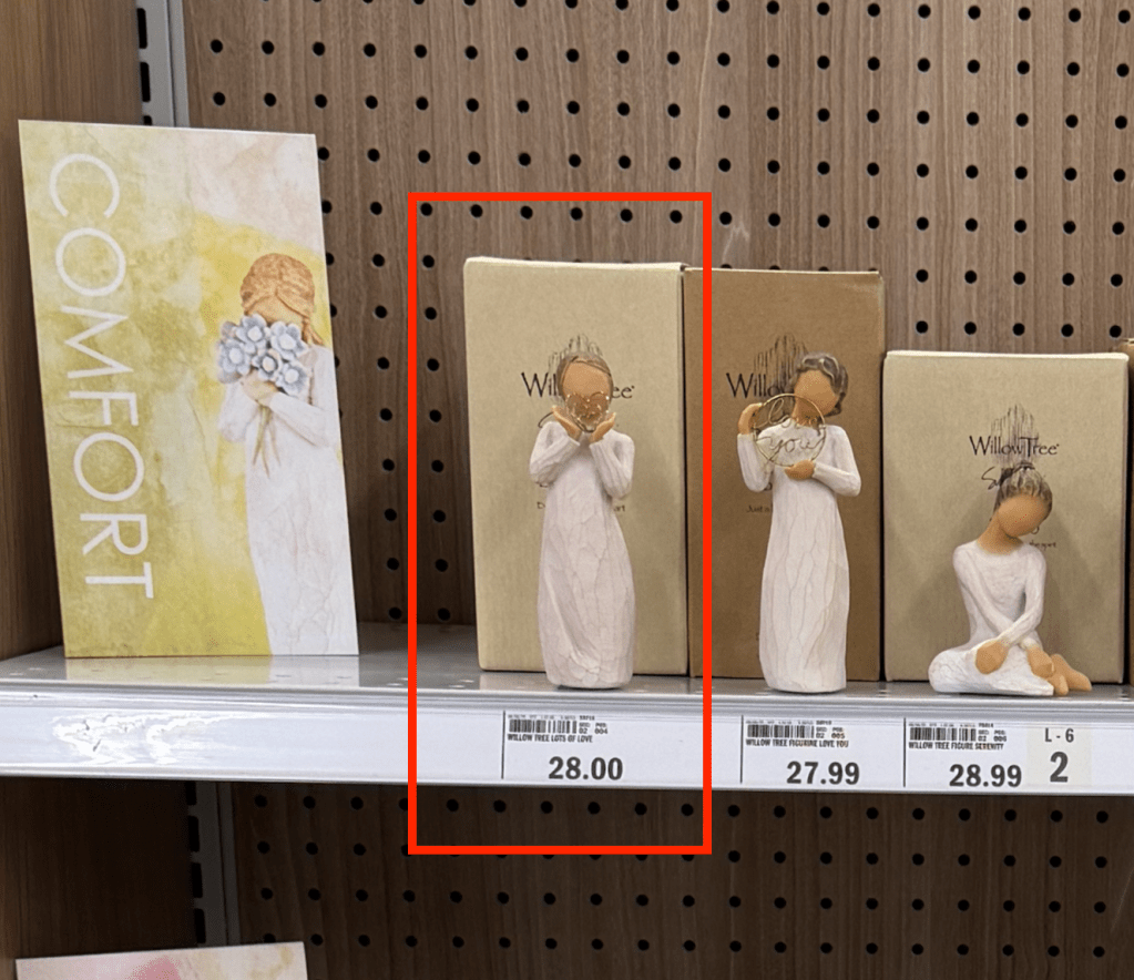 Borrow the Willow Tree Lots of Love display from the endcap to replace the damaged figurine that is missing the piece held in the figures hand. The figurine on the pod does not have the heart in hand.