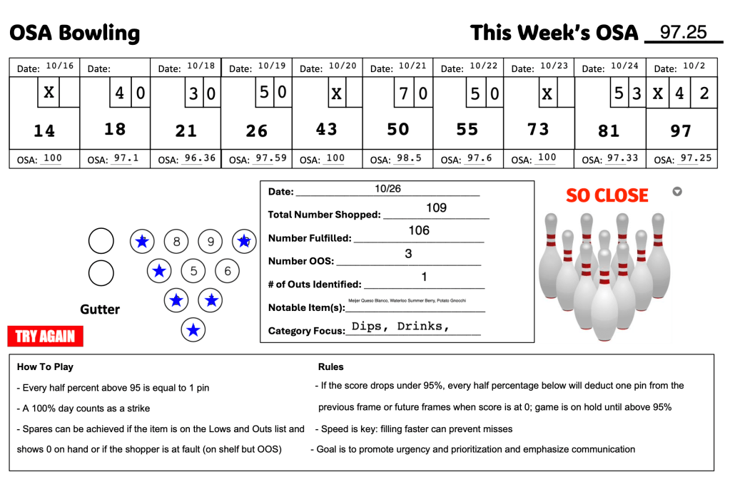 For the week, we finished with a 98.38, which was good for third (store 304 took first place), but I am most impressed with the achievement of three 98% and above OSA weeks in Period 10! That made for an impressive 148 bowling score and 5 strikes!