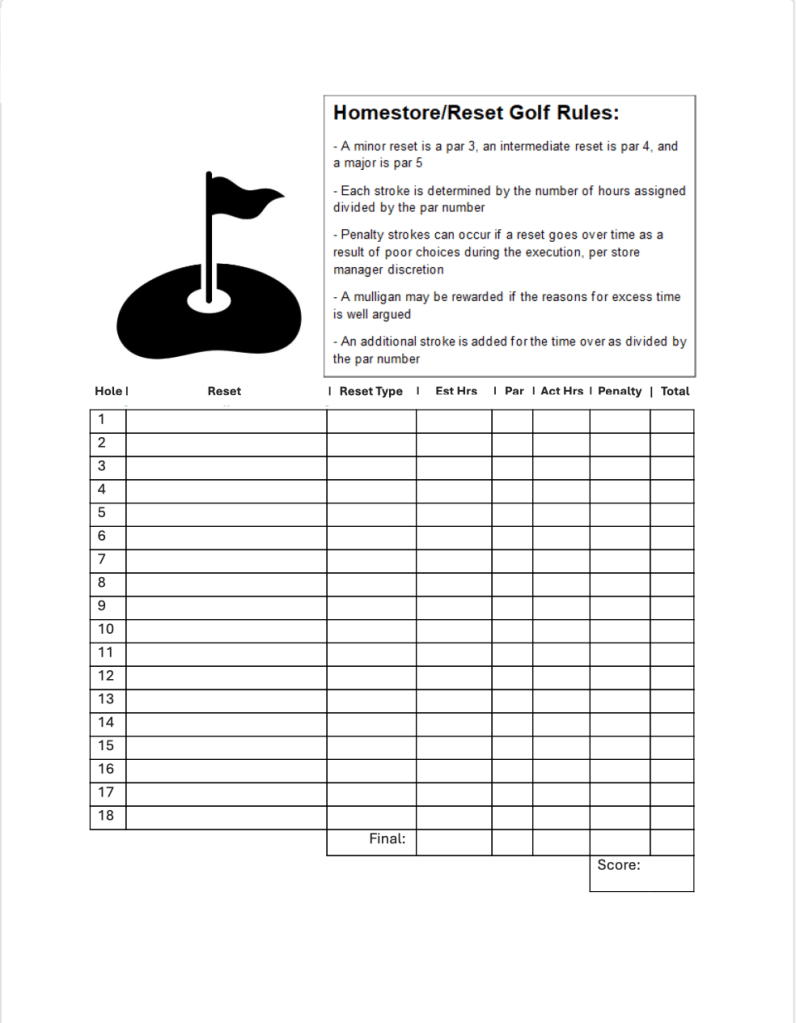 Starting after Moratorium, in 2026, I will be scoring reset performances through “Reset Golf”. This encourages efficiency and accountability, while promoting budget awareness.