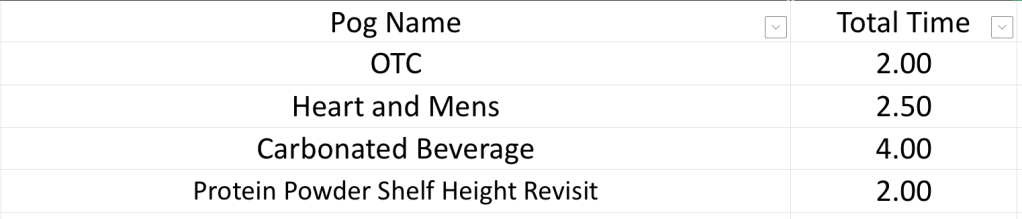 For Carbonated Beverages, Nathaniel says this will take potentially the full amount of time because he does want it set to planogram, which would mean shelf movement and a lot of product movement as well.